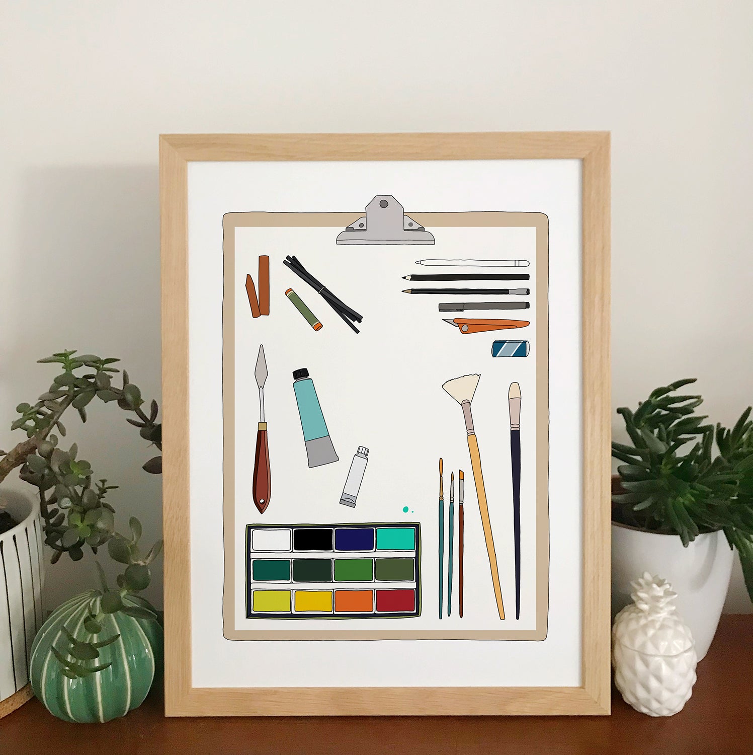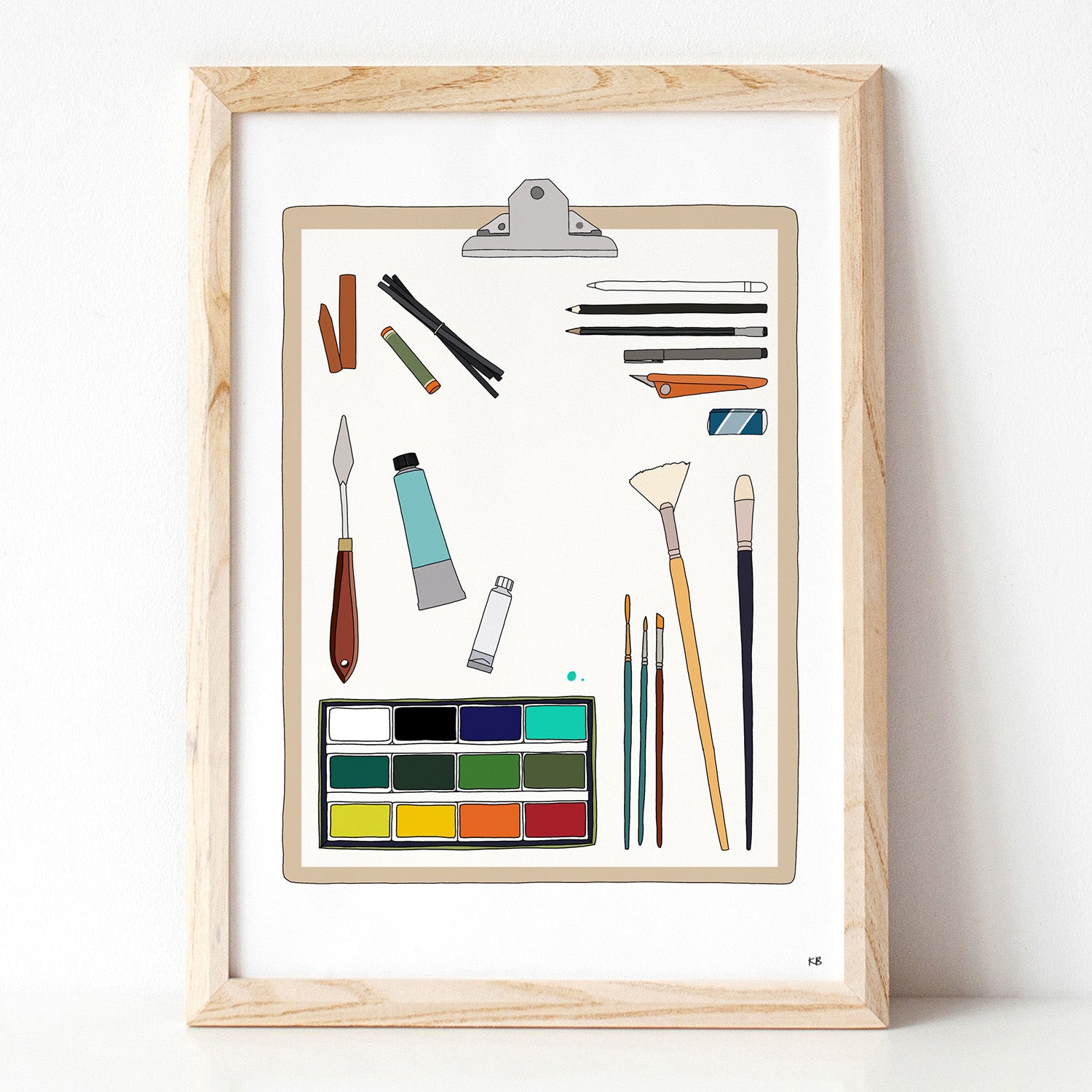Art materials illustrated wall art print, featuring various drawing, sketching and painting materials.