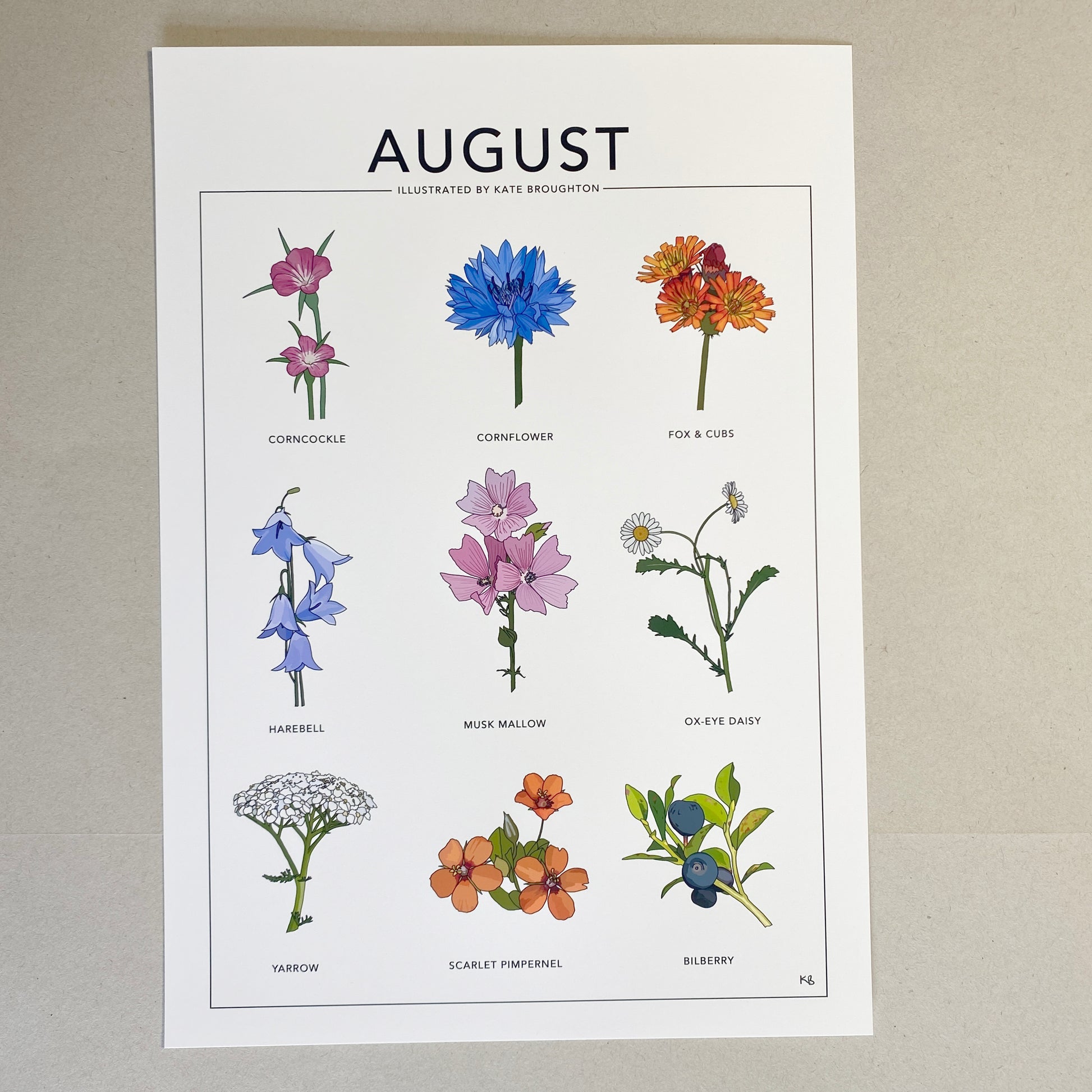 August illustrated, a perfect gift for an August birthday. Featuring 9 of my original illustrations of seasonal plants: Corncockle, Cornflower, Fox & Cubs, Harebell, Musk Mallow, Ox-Eye Daisy, Yarrow, Scarlet Pimpernel and Bilberry.