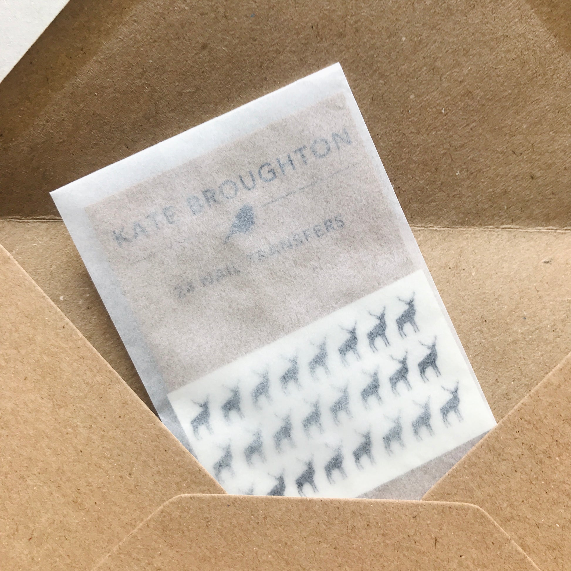I have made these nail transfers from my original deer drawing, there are 24 to cut out from the sheet, and they look great on bare nails or over coloured varnish.