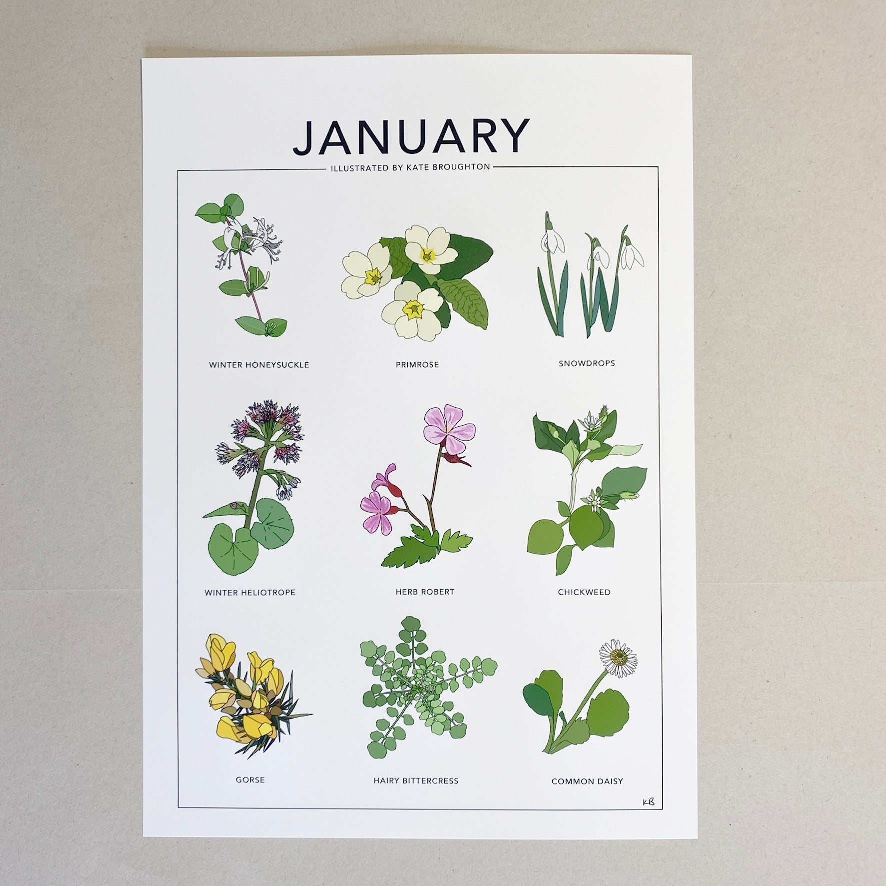 January illustrated, a perfect gift for a January birthday. Featuring 9 of my original illustrations of seasonal plants: Winter honeysuckle, primrose, snowdrops, winter heliotrope, herb robert, chickweed, gorse, hairy bittercress and common daisy.