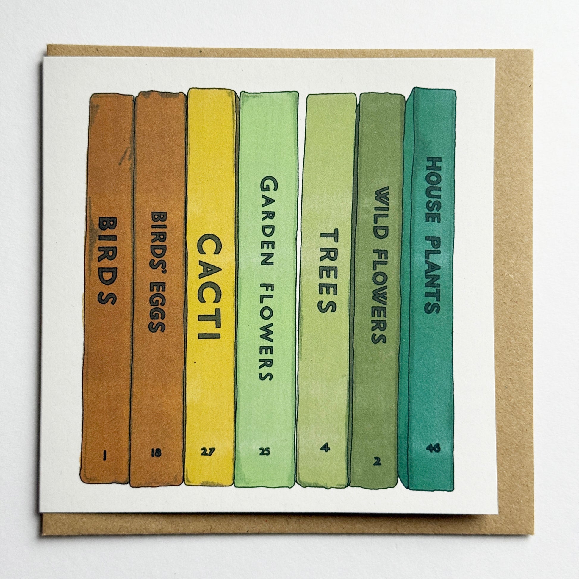 Illustrated card featuring a hand drawn digital watercolour painting of my vintage nature book collection.