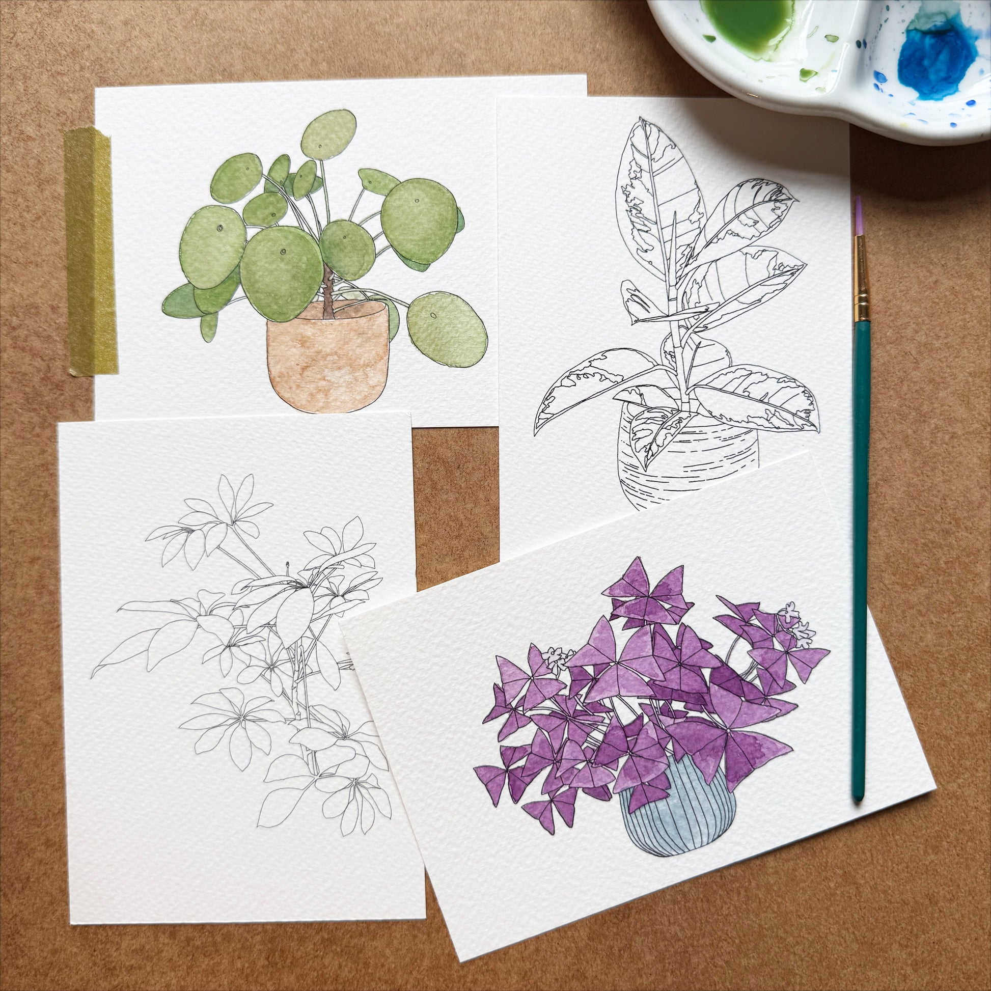Hand drawn houseplant illustrations for you to colour in yourself. Let your creativity flow, this is a great way to get into watercolour or just a relaxing way to do some colouring in on high quality thick textured watercolour paper. There's a Pilea, Oxalis, rubber plant, and Schefflera Umbrella plant.
