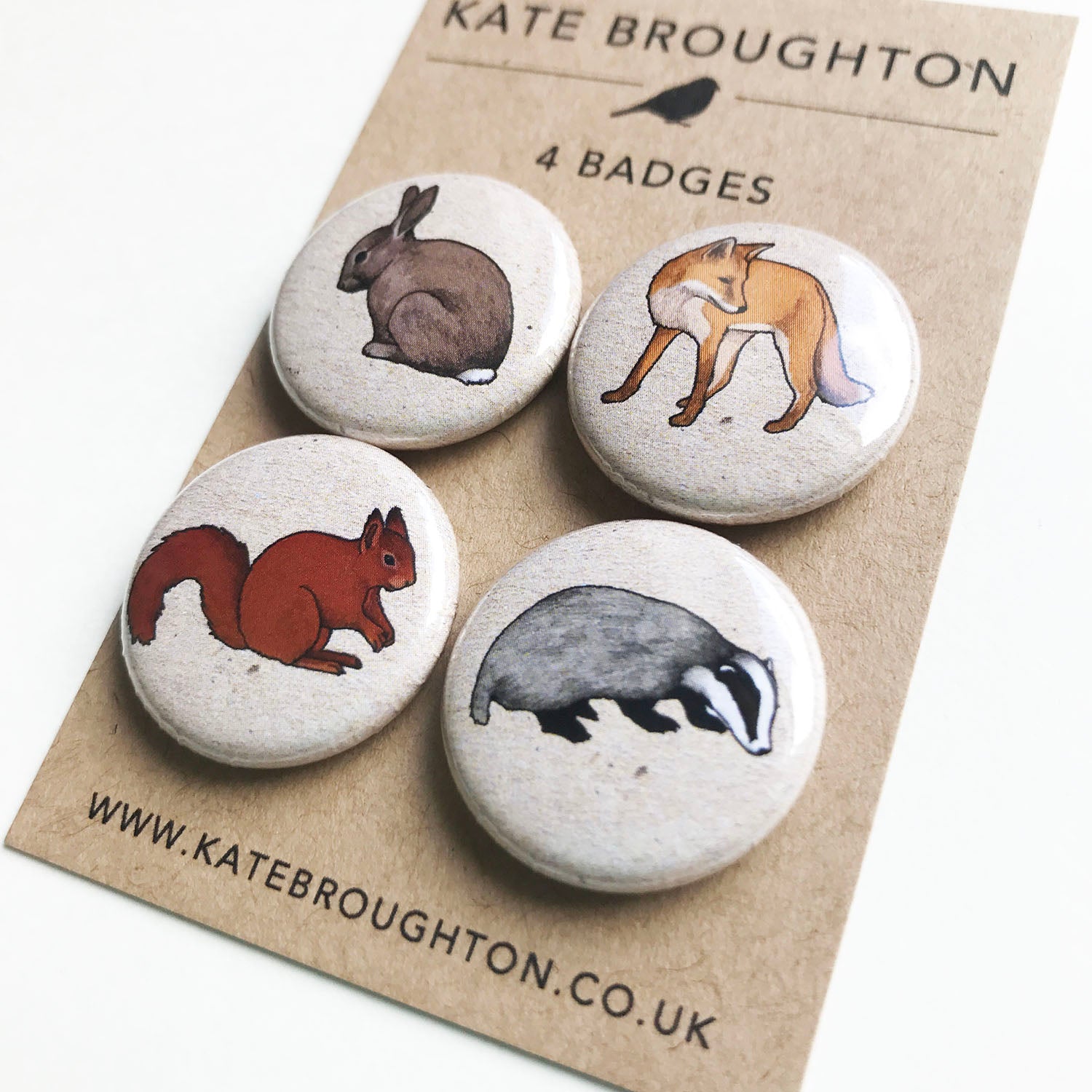 This is a set of four badges with my woodland animal illustrations on (rabbit, fox, badger and red squirrel). The badges are 2.5 cm wide with a metal back and clasp.